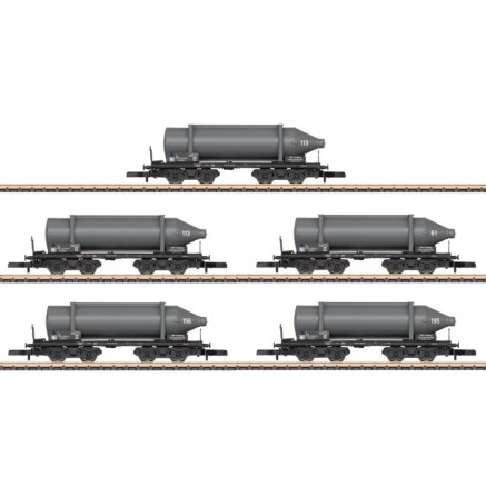 Diese Set aus fünf Spezialwagen für den Transport von Carbid ist beim SKW Trostberg beheimatet und bei der DB der Epoche IV eingestellt. Die Wagen und die "Flaschen" tragen unterschiedliche Betriebsnummern.